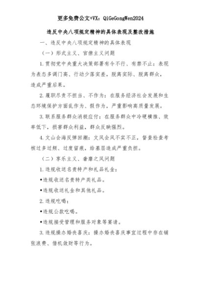 【七哥公文】2025年:违反中央八项规定精神的具体表现及整改措施+更多免费公文+VX:QiGeGongWen2024+更多免费公文+VX:QiGeGongWen2024