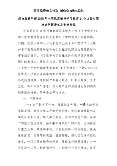 【七哥公文】2025年:纪检监察干部2025年八项规定精神学习教育11个方面对照检查问题清单及整改措施+更多免费公文+VX:QiGeGongWen2024+更多免费公文+VX:QiGeGongWen2024