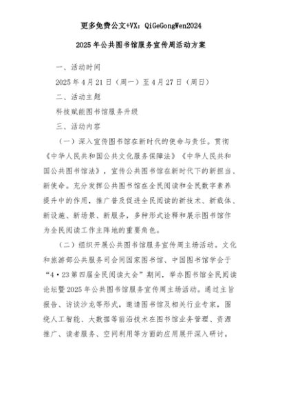 【七哥公文】2025年:2025年公共图书馆服务宣传周活动方案+更多免费公文+VX:QiGeGongWen2024+更多免费公文+VX:QiGeGongWen2024