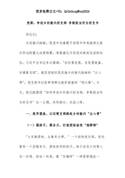 【七哥公文】2025年:党课:争创乡村振兴好支部 争做担当作为好支书+更多免费公文+VX:QiGeGongWen2024+更多免费公文+VX:QiGeGongWen2024