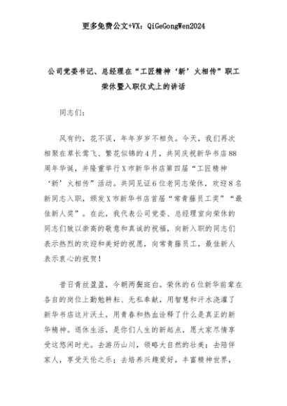 【七哥公文】2025年:公司党委书记、总经理在“工匠精神‘新’火相传”职工荣休暨入职仪式上的讲话(新华书店)+更多免费公文+VX:QiGeGongWen2024+更多免费公文+VX:QiGeGongWen2024