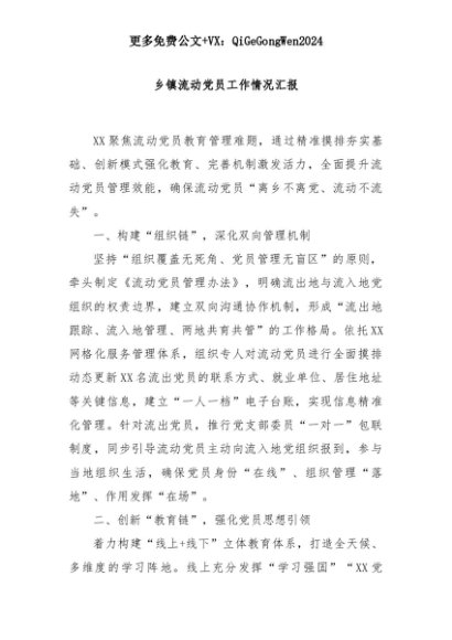 【七哥公文】2025年:乡镇流动党员工作情况汇报+更多免费公文+VX:QiGeGongWen2024+更多免费公文+VX:QiGeGongWen2024