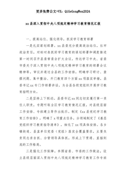 【七哥公文】2025年:xx县深入贯彻中央八项规定精神学习教育情况汇报+更多免费公文+VX:QiGeGongWen2024+更多免费公文+VX:QiGeGongWen2024