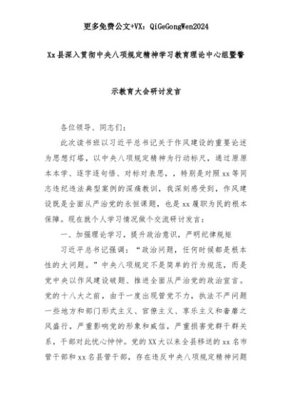【七哥公文】2025年:Xx县深入贯彻中央八项规定精神学习教育理论中心组暨警示教育大会研讨发言+更多免费公文+VX:QiGeGongWen2024+更多免费公文+VX:QiGeGongWen2024