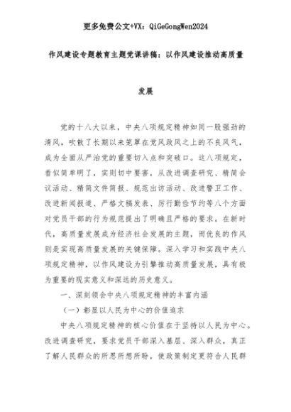 【七哥公文】2025年:作风建设专题教育主题党课讲稿:以作风建设推动高质量发展+更多免费公文+VX:QiGeGongWen2024+更多免费公文+VX:QiGeGongWen2024