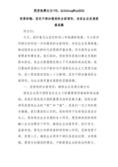 【七哥公文】2025年:党课讲稿:坚定不移加强党的全面领导,夯实企业发展根基底蕴+更多免费公文+VX:QiGeGongWen2024+更多免费公文+VX:QiGeGongWen2024