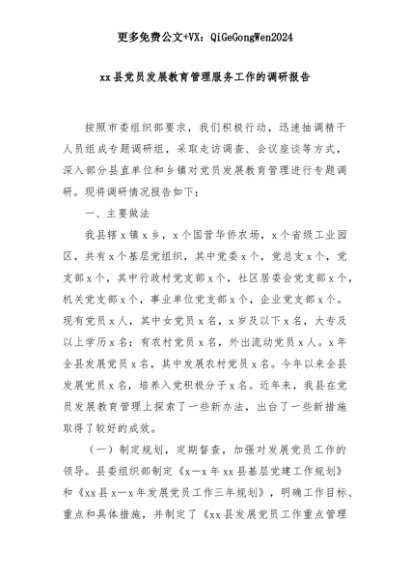 【七哥公文】2025年:xx县党员发展教育管理服务工作的调研报告+更多免费公文+VX:QiGeGongWen2024+更多免费公文+VX:QiGeGongWen2024