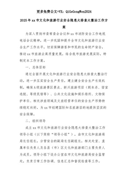 【七哥公文】2025年:2025年xx市文化和旅游行业安全隐患大排查大整治工作方案+更多免费公文+VX:QiGeGongWen2024+更多免费公文+VX:QiGeGongWen2024