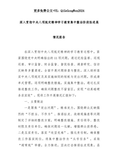【七哥公文】2025年:深入贯彻中央八项规定精神学习教育集中整治阶段性进展情况报告+更多免费公文+VX:QiGeGongWen2024+更多免费公文+VX:QiGeGongWen2024