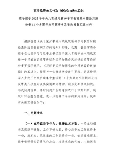【七哥公文】2025年:领导班子2025年中央八项规定精神学习教育集中整治对照检查11个方面突出问题清单及整改措施汇报材料+更多免费公文+VX:QiGeGongWen2024+更多免费公文+VX:QiGeGongWen2024