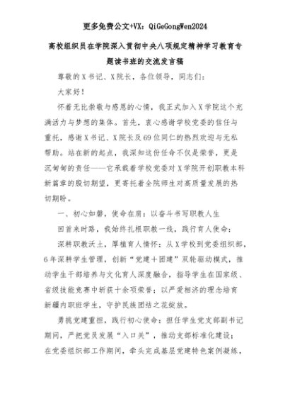 【七哥公文】2025年:高校组织员在学院深入贯彻中央八项规定精神学习教育专题读书班的交流发言稿+更多免费公文+VX:QiGeGongWen2024+更多免费公文+VX:QiGeGongWen2024