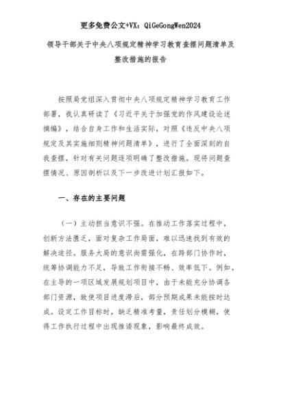【七哥公文】2025年:领导干部关于中央八项规定精神学习教育查摆问题清单及整改措施的报告+更多免费公文+VX:QiGeGongWen2024+更多免费公文+VX:QiGeGongWen2024