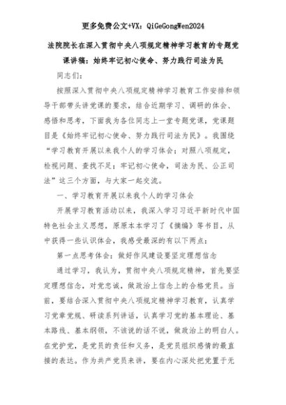 【七哥公文】2025年:法院院长在深入贯彻中央八项规定精神学习教育的专题党课讲稿:始终牢记初心使命、努力践行司法为民+更多免费公文+VX:QiGeGongWen2024+更多免费公文+VX:QiGeGongWen2024