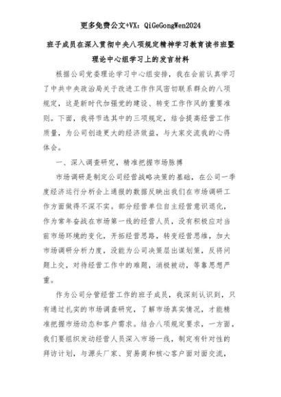 【七哥公文】2025年:班子成员在深入贯彻中央八项规定精神学习教育读书班暨理论中心组学习上的发言材料+更多免费公文+VX:QiGeGongWen2024+更多免费公文+VX:QiGeGongWen2024