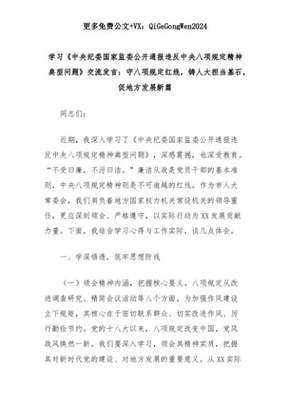 【七哥公文】2025年:学习《中央纪委国家监委公开通报违反中央八项规定精神典型问题》交流发言:守八项规定红线,铸人大担当基石,促地方发展新篇+更多免费公文+VX:QiGeGongWen2024+更多免费公文+VX:QiGeGongWen2024