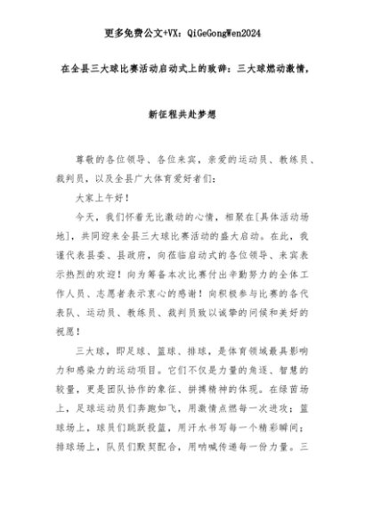 【七哥公文】2025年:在全县三大球比赛活动启动式上的致辞:三大球燃动激情,新征程共赴梦想+更多免费公文+VX:QiGeGongWen2024+更多免费公文+VX:QiGeGongWen2024