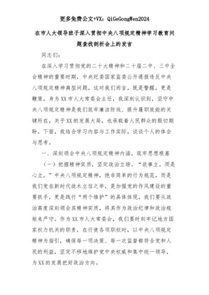 【七哥公文】2025年:在市人大领导班子深入贯彻中央八项规定精神学习教育问题查找剖析会上的发言+更多免费公文+VX:QiGeGongWen2024+更多免费公文+VX:QiGeGongWen2024