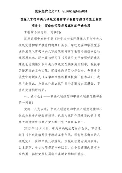 【七哥公文】2025年:在深入贯彻中央八项规定精神学习教育专题读书班上的交流发言:深学细悟强根基真抓实干优作风+更多免费公文+VX:QiGeGongWen2024+更多免费公文+VX:QiGeGongWen2024