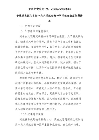 【七哥公文】2025年:普通党员深入贯彻中央八项规定精神学习教育查摆问题清单+更多免费公文+VX:QiGeGongWen2024+更多免费公文+VX:QiGeGongWen2024