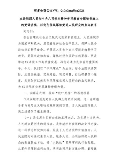 【七哥公文】2025年:在法院深入贯彻中央八项规定精神学习教育专题读书班上的党课讲稿:以优良作风厚植党同人民群众的血肉联系+更多免费公文+VX:QiGeGongWen2024+更多免费公文+VX:QiGeGongWen2024