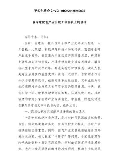 【七哥公文】2025年:在专家赋能产业升级工作会议上的讲话+更多免费公文+VX:QiGeGongWen2024+更多免费公文+VX:QiGeGongWen2024