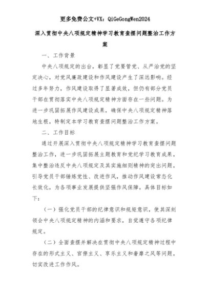 【七哥公文】2025年:深入贯彻中央八项规定精神学习教育查摆问题整治工作方案+更多免费公文+VX:QiGeGongWen2024+更多免费公文+VX:QiGeGongWen2024