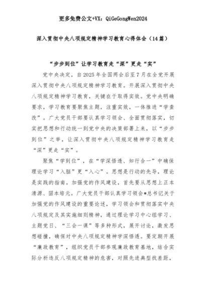 【七哥公文】2025年:(14篇)深入贯彻中央八项规定精神学习教育心得体会+更多免费公文+VX:QiGeGongWen2024+更多免费公文+VX:QiGeGongWen2024