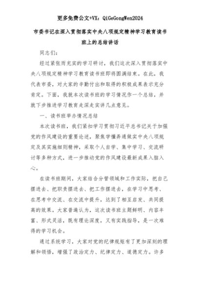 【七哥公文】2025年:市委书记在深入贯彻落实中央八项规定精神学习教育读书班上的总结讲话+更多免费公文+VX:QiGeGongWen2024+更多免费公文+VX:QiGeGongWen2024