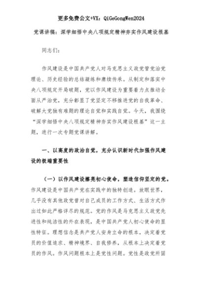 【七哥公文】2025年:党课讲稿:深学细悟中央八项规定精神夯实作风建设根基+更多免费公文+VX:QiGeGongWen2024+更多免费公文+VX:QiGeGongWen2024