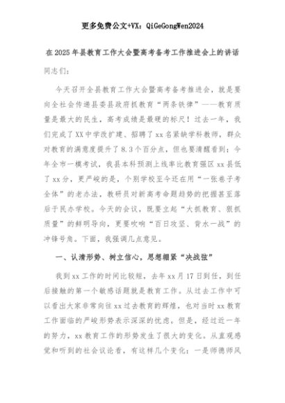 【七哥公文】2025年:在2025年县教育工作大会暨高考备考工作推进会上的讲话+更多免费公文+VX:QiGeGongWen2024+更多免费公文+VX:QiGeGongWen2024