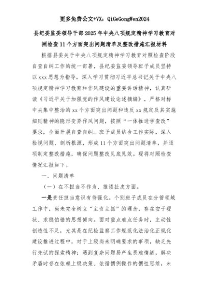 【七哥公文】2025年:县纪委监委领导干部2025年中央八项规定精神学习教育对照检查11个方面突出问题清单及整改措施汇报材料+更多免费公文+VX:QiGeGongWen2024+更多免费公文+VX:QiGeGongWen2024