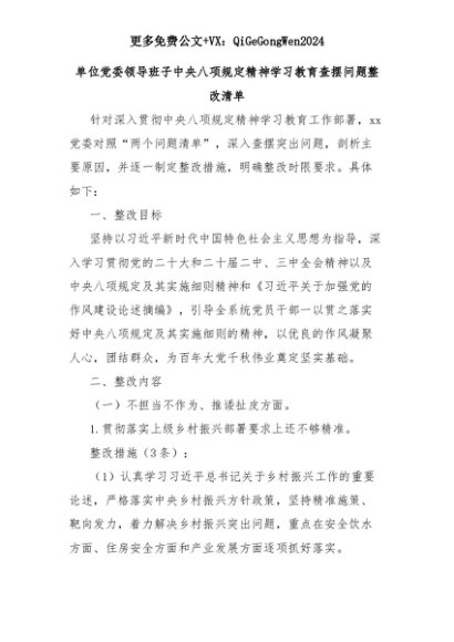 【七哥公文】2025年:单位党委领导班子中央八项规定精神学习教育查摆问题整改清单+更多免费公文+VX:QiGeGongWen2024+更多免费公文+VX:QiGeGongWen2024