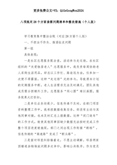 【七哥公文】2025年:八项规定28个方面查摆问题清单和整改措施(个人版)+更多免费公文+VX:QiGeGongWen2024+更多免费公文+VX:QiGeGongWen2024