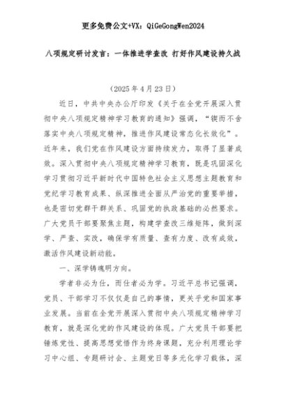 【七哥公文】2025年:八项规定研讨发言:一体推进学查改 打好作风建设持久战+更多免费公文+VX:QiGeGongWen2024+更多免费公文+VX:QiGeGongWen2024