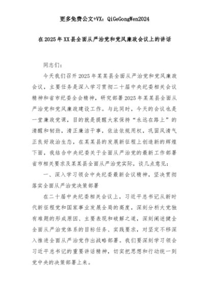 【七哥公文】2025年:在2025年XX县全面从严治党和党风廉政会议上的讲话+更多免费公文+VX:QiGeGongWen2024+更多免费公文+VX:QiGeGongWen2024