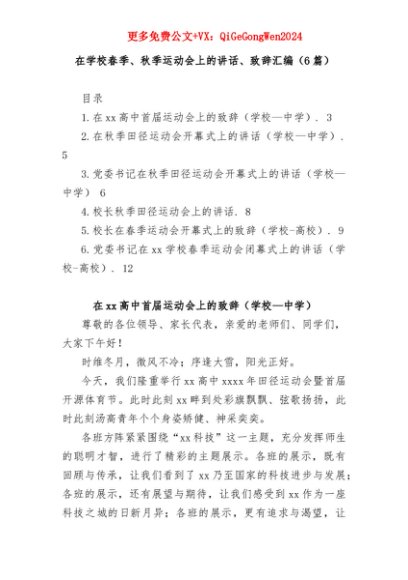 【七哥公文】2025年:(6篇)在学校春季、秋季运动会上的讲话、致辞汇编+更多免费公文+VX:QiGeGongWen2024+更多免费公文+VX:QiGeGongWen2024
