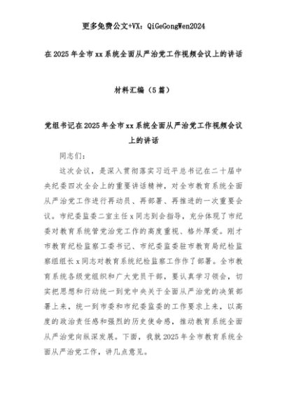【七哥公文】2025年:(5篇)在2025年全市xx系统全面从严治党工作视频会议上的讲话材料汇编+更多免费公文+VX:QiGeGongWen2024+更多免费公文+VX:QiGeGongWen2024