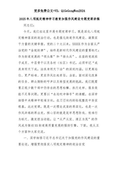【七哥公文】2025年:2025年八项规定精神学习教育加强作风建设专题党课讲稿+更多免费公文+VX:QiGeGongWen2024+更多免费公文+VX:QiGeGongWen2024