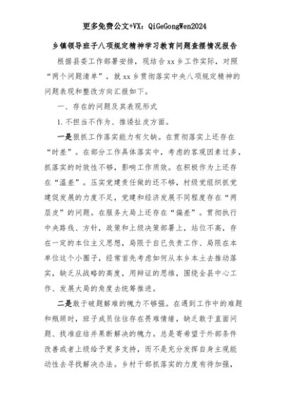 【七哥公文】2025年:乡镇领导班子八项规定精神学习教育问题查摆情况报告+更多免费公文+VX:QiGeGongWen2024+更多免费公文+VX:QiGeGongWen2024