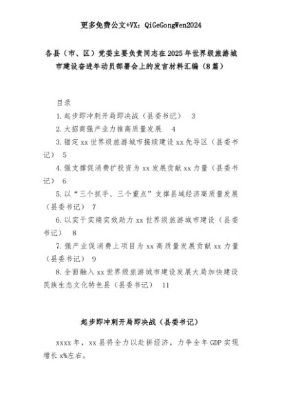 【七哥公文】2025年:(8篇)各县(市、区)党委主要负责同志在2025年世界级旅游城市建设奋进年动员部署会上的发言材料汇编+更多免费公文+VX:QiGeGongWen2024+更多免费公文+VX:QiGeGongWen2024