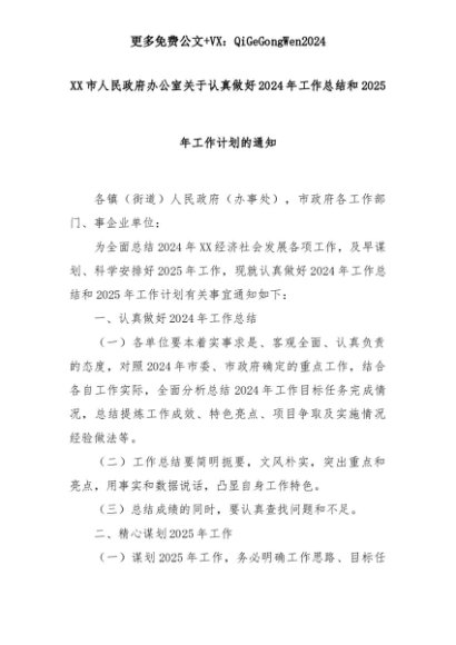 【七哥公文】2025年:XX市人民政府办公室关于认真做好2024年工作总结和2025年工作计划的通知+更多免费公文+VX:QiGeGongWen2024+更多免费公文+VX:QiGeGongWen2024