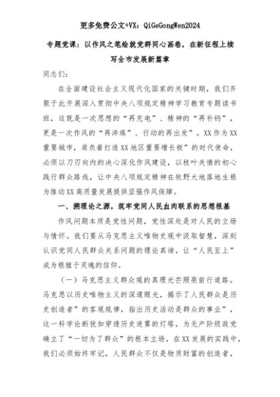 【七哥公文】2025年:专题党课:以作风之笔绘就党群同心画卷,在新征程上续写全市发展新篇章+更多免费公文+VX:QiGeGongWen2024+更多免费公文+VX:QiGeGongWen2024