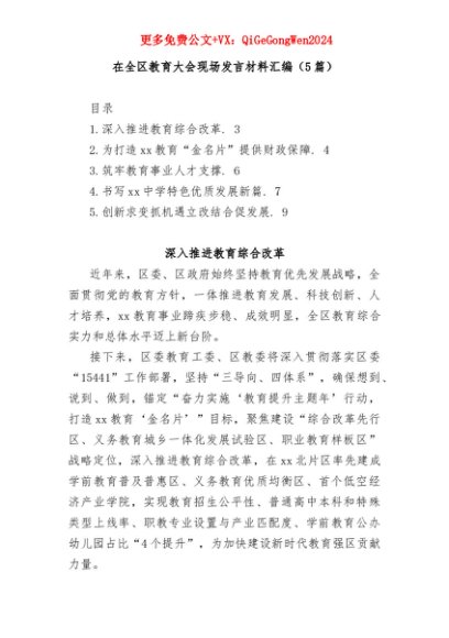 【七哥公文】2025年:(5篇)在全区教育大会现场发言材料汇编+更多免费公文+VX:QiGeGongWen2024+更多免费公文+VX:QiGeGongWen2024