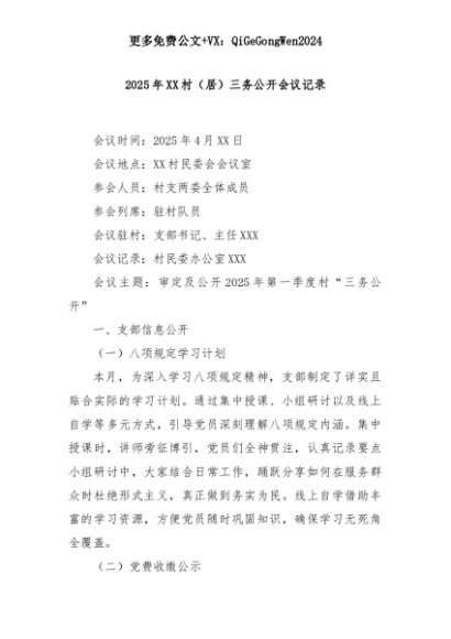 【七哥公文】2025年:2025年XX村(居)三务公开会议记录+更多免费公文+VX:QiGeGongWen2024+更多免费公文+VX:QiGeGongWen2024