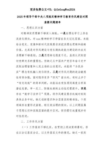 【七哥公文】2025年:2025年领导干部中央八项规定精神学习教育作风建设对照查摆问题清单+更多免费公文+VX:QiGeGongWen2024+更多免费公文+VX:QiGeGongWen2024