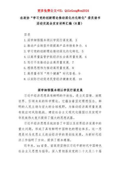 【七哥公文】2025年:(8篇)在政协“学习党的创新理论推动深化内化转化”委员读书活动交流会发言材料汇编+更多免费公文+VX:QiGeGongWen2024+更多免费公文+VX:QiGeGongWen2024