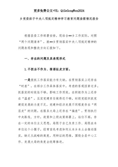 【七哥公文】2025年:乡党委班子中央八项规定精神学习教育问题查摆情况报告+更多免费公文+VX:QiGeGongWen2024+更多免费公文+VX:QiGeGongWen2024