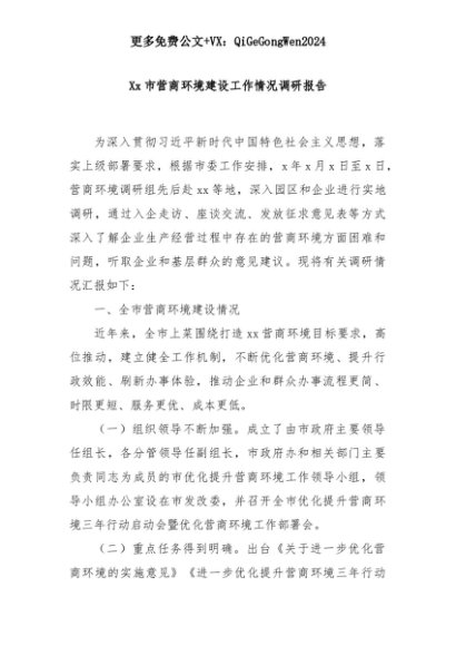 【七哥公文】2025年:Xx市营商环境建设工作情况调研报告+更多免费公文+VX:QiGeGongWen2024+更多免费公文+VX:QiGeGongWen2024