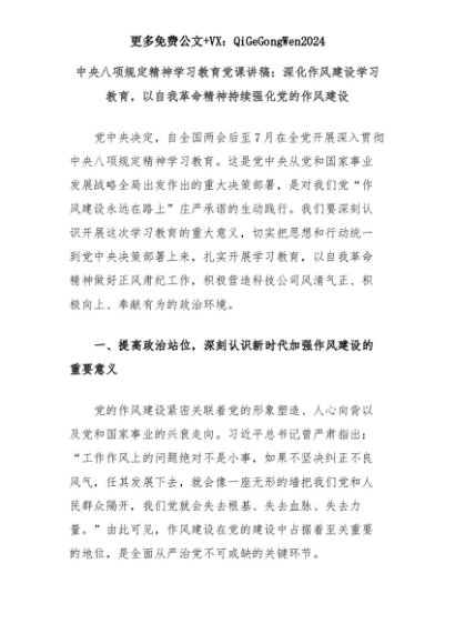 【七哥公文】2025年:中央八项规定精神学习教育党课讲稿:深化作风建设学习教育,以自我革命精神持续强化党的作风建设+更多免费公文+VX:QiGeGongWen2024+更多免费公文+VX:QiGeGongWen2024