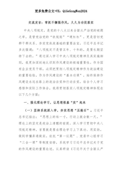 【七哥公文】2025年:交流发言:常抓不懈强作风,久久为功促落实+更多免费公文+VX:QiGeGongWen2024+更多免费公文+VX:QiGeGongWen2024